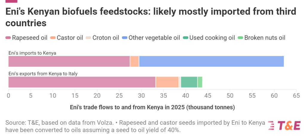 Dai dati commerciali analizzati da T&T emerge però che una parte rilevante delle materie prime utilizzate non sarebbe prodotta localmente. In particolare, risultano importazioni di colza dal Sudafrica nelle controllate keniote di Eni.