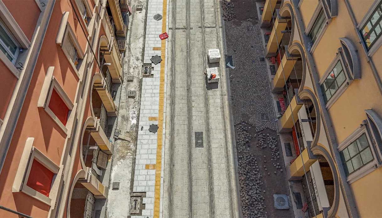 Nell’ultima fase dei lavori verranno installate le pensiline delle fermate e i relativi impianti tecnologici. Questo segmento sarà catenary free: non verranno montati pali né fili della trazione elettrica, poiché i tram lo percorreranno alimentati da batterie. La pavimentazione dell’intera via è stata completamente rinnovata con materiali condivisi con la Soprintendenza. La sede tranviaria, posta alla stessa quota della carreggiata, è stata realizzata con basoli in granito e dotata di segnapassi luminosi a LED che delineano il percorso in orario serale; per il resto della strada sono stati impiegati sanpietrini e basoli già presenti in zona.