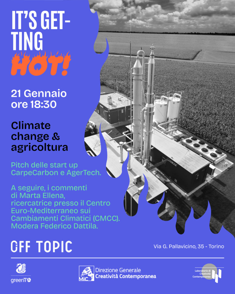 Dalle ore 18:30 alle 20 OFF TOPIC ospiterà i contributi di due startup innovative nel torinese: CarpeCarbon, azienda pioniera nel settore della cattura diretta di anidride carbonica nell’aria, e Ager Tech, realtà che offre soluzioni innovative nel settore agricultural technology per ottimizzare la produttività e sostenibilità delle aziende agricole. Esperienze a cui seguiranno i commenti di Marta Ellena, dottoressa di ricerca in Scienza e Gestione dei Cambiamenti Climatici presso il Centro Euro-Mediterraneo sui Cambiamenti Climatici (CMCC), con la moderazione di Federico Dattila, dottore di ricerca in Scienza e Tecnologia Chimica e attualmente ricercatore Maria Skłodowska-Curie presso il Politecnico di Torino, oltre che tesoriere greenTO.