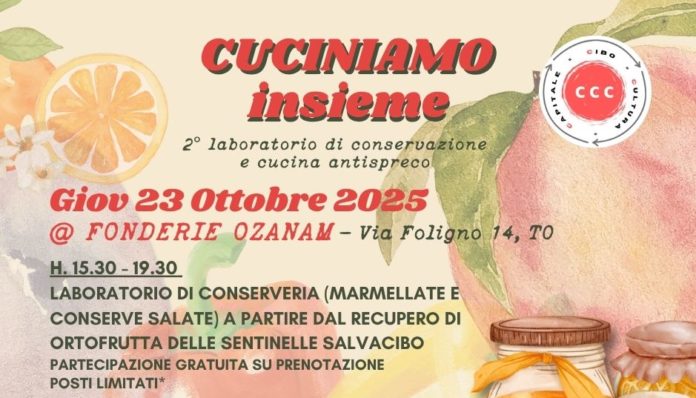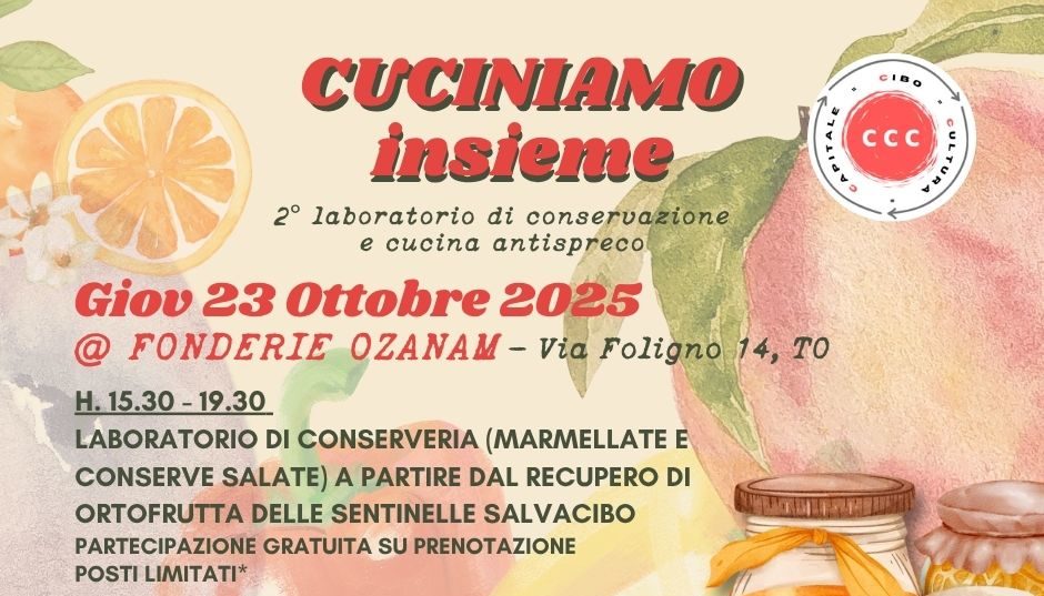 Il prossimo appuntamento di CCC è per giovedì 23 ottobre presso le Fonderie Ozanam, una cooperativa sociale senza scopo di lucro che opera nel mondo della ristorazione da 33 anni, all’interno di uno spazio rigenerato aperto alla cittadinanza. Questa tappa propone un laboratorio pomeridiano di conserveria, seguito dalla ormai consueta cena solidale antispreco.