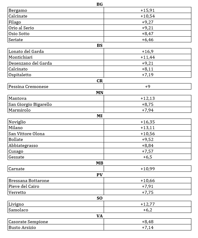 I 30 comuni lombardi ‘mangiasuolo’ nel 2024 (dati in ettari, Ha, variazione 2023-2024)