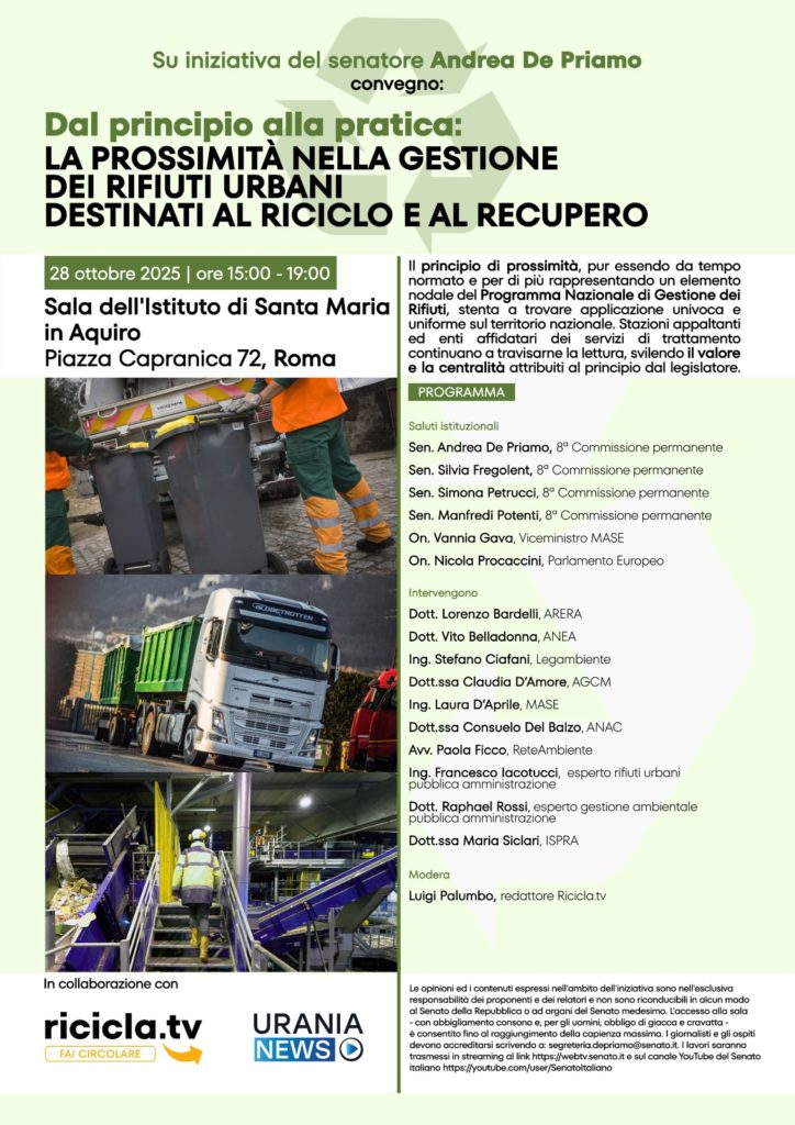 A questo tema, centrale per la pianificazione e l’efficienza del sistema nazionale dei rifiuti differenziati, sarà dedicato il convegno “Dal principio alla pratica: la prossimità nella gestione dei rifiuti urbani destinati al riciclo e al recupero”, promosso dal Senatore Andrea De Priamo e in programma martedì 28 ottobre dalle ore 15.00 alle 19.00 presso la Sala dell’Istituto di Santa Maria in Aquiro, in Piazza Capranica 72, Roma.