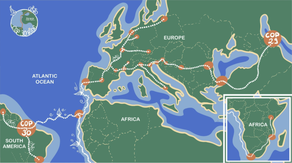 La staffetta ciclistica internazionale è partita dall’Azerbaijan, dalla capitale Baku, dove l’hanno scorso si è svolta la Cop29, e ha coinvolto Croazia, Paesi Bassi, Georgia, Slovenia, Belgio, Turchia, Italia, Francia, Spagna, Portogallo, Germania, Bulgaria, Romania, Serbia e Polonia. A questi Paesi si aggiunge la divisione dell’Africa, partita da Nairobi, e alcuni rami partiti dalle città brasiliane di Recife, Rio de Janeiro e Santarém. La più lunga delle staffette, quella euroasiatica dall’Azerbaijan al Brasile, ha svolto il suo percorso interamente in modo attivo: attraversando il continente eurasiatico in bicicletta e attraversando l’Oceano atlantico in barca a vela.