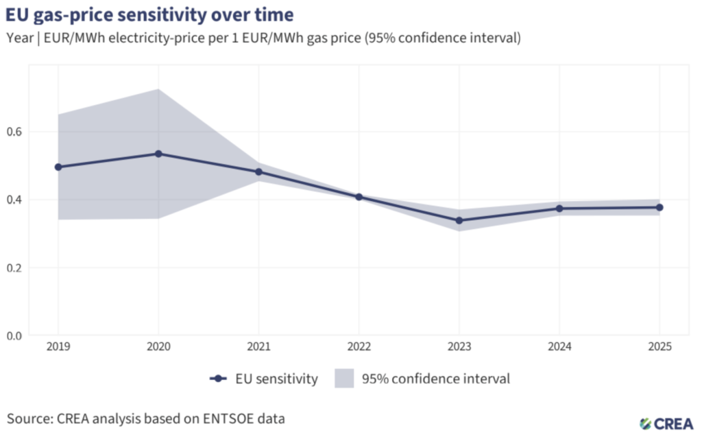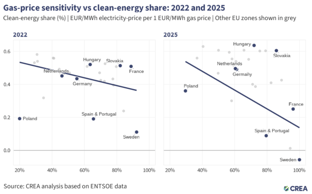 Nel 2025 ogni aumento dei prezzi del gas di 1 al megawattora ha portato a un aumento di 0,37 euro per megawattora dei prezzi dell’elettricità: si tratta di una riduzione dell’8% rispetto al 2022. Ciò è direttamente collegato all’allontanamento dal gas e agli investimenti in energia pulita, la cui quota verso la generazione di elettricità nell’Ue è cresciuta del 14% nel 2025 rispetto al 2022.