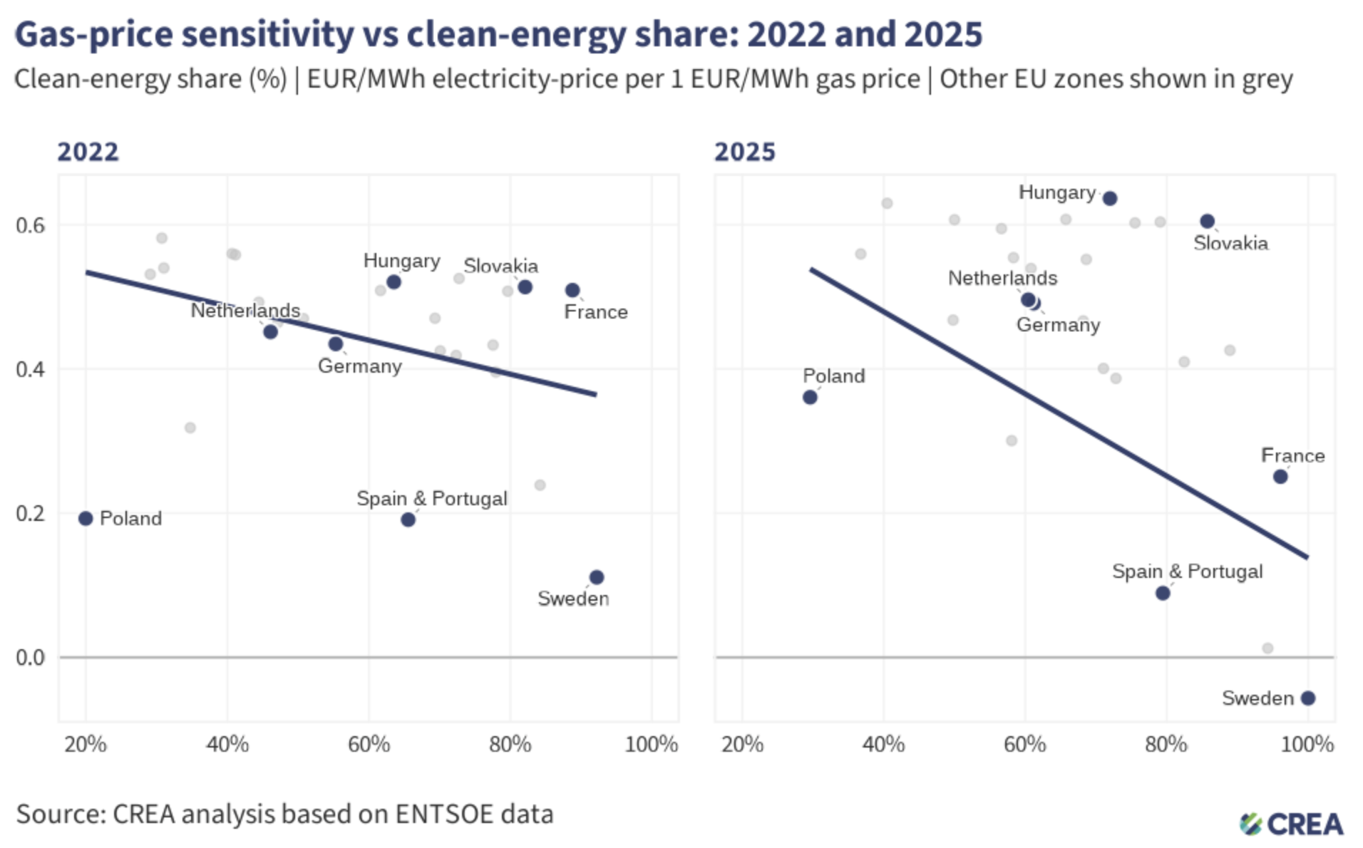 Il reindirizzamento della Polonia verso il gas, piuttosto che verso fonti di energia pulita, ha aumentato la produzione di gas del 132% nel 2025 rispetto al 2022. Questa maggiore dipendenza, che ha costituito il 13% del totale nel 2025, ha fatto sì che anche la sensibilità ai prezzi del gas è aumentata dell’87% a 0,36 al megawattora per ogni spostamento di 1 euro nel prezzo del gas.