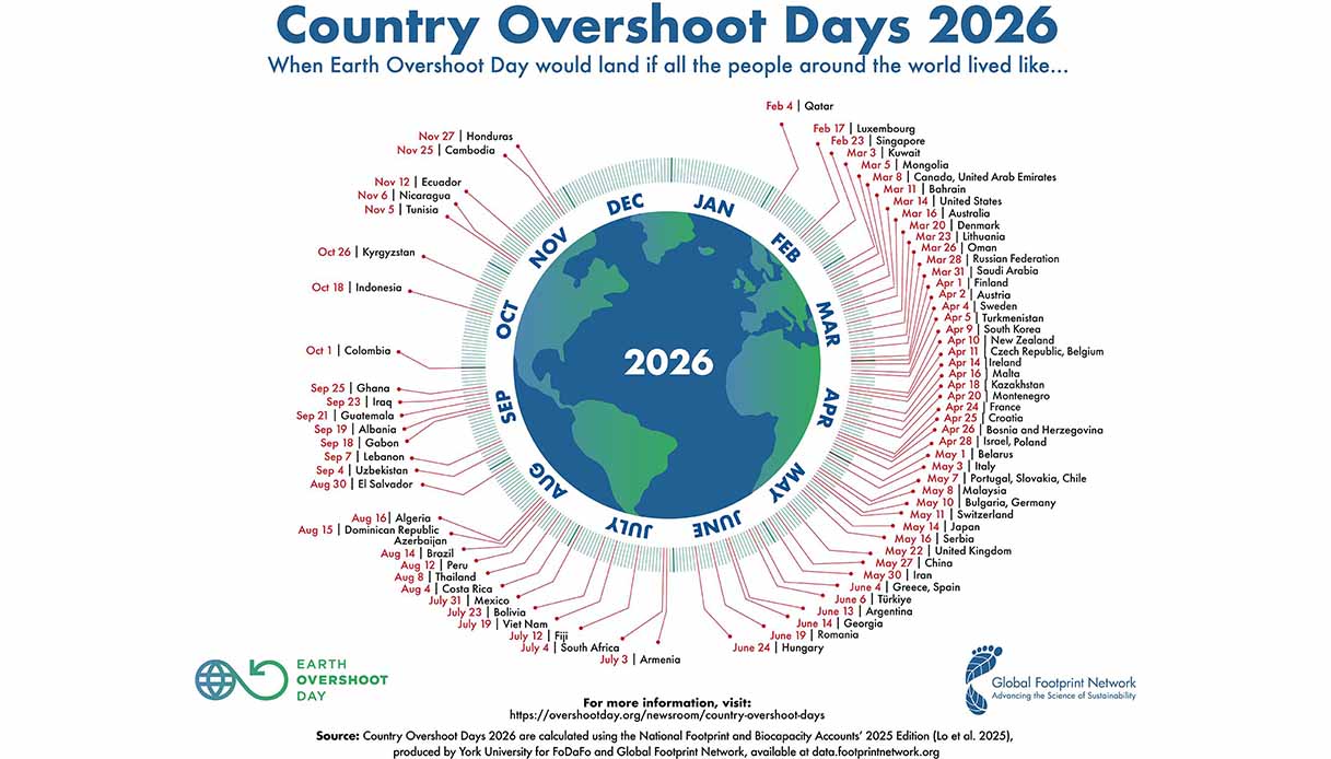 Il 3 maggio 2026 segna per l’Italia il Country Overshoot Day, la data in cui, in base ai calcoli del Global Footprint Network, verrebbero esaurite le risorse naturali disponibili per l’intero anno se l’intera popolazione mondiale adottasse lo stesso livello di consumo.