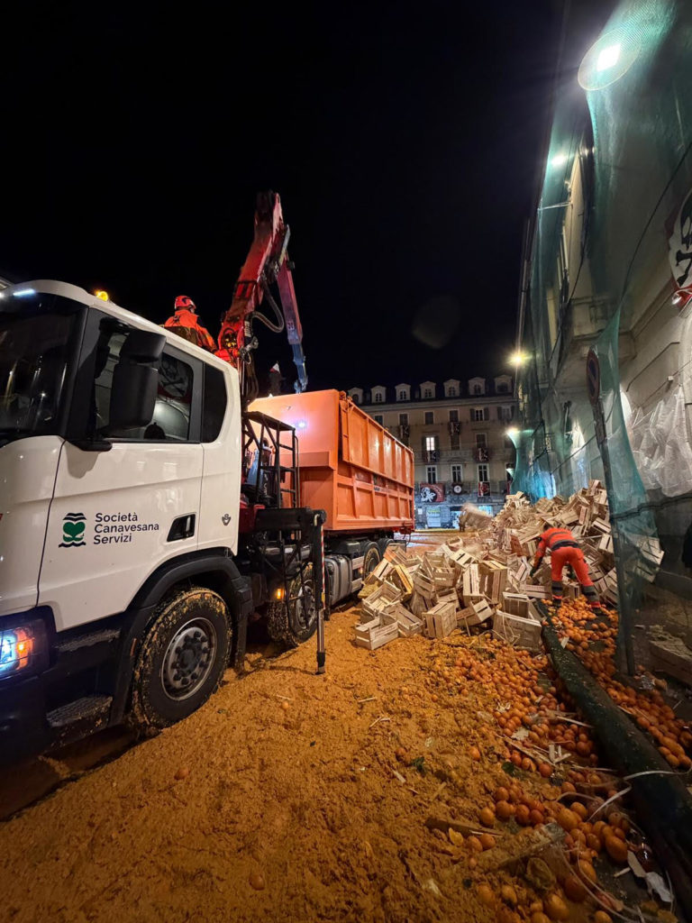 Le arance raccolte quest’anno si sono leggermente ridotte rispetto al 2025 (da 731.000 kg a quasi 725.000) e sono state conferite in ben 4 impianti di smaltimento e riciclo: TERRITORIO E RISORSE SRL a Santhià (Vercelli) e G.A.I.A. S.P.A. a San Damiano d’Asti, KOSTER Srl a San Nazario Sesia (Novara), ACEA PINEROLESE INDUSTRIALE S.P.A. a Pinerolo (Torino). Per il conferimento in impianto si sono resi necessari ben 25 viaggi andata e ritorno nelle diverse destinazioni.