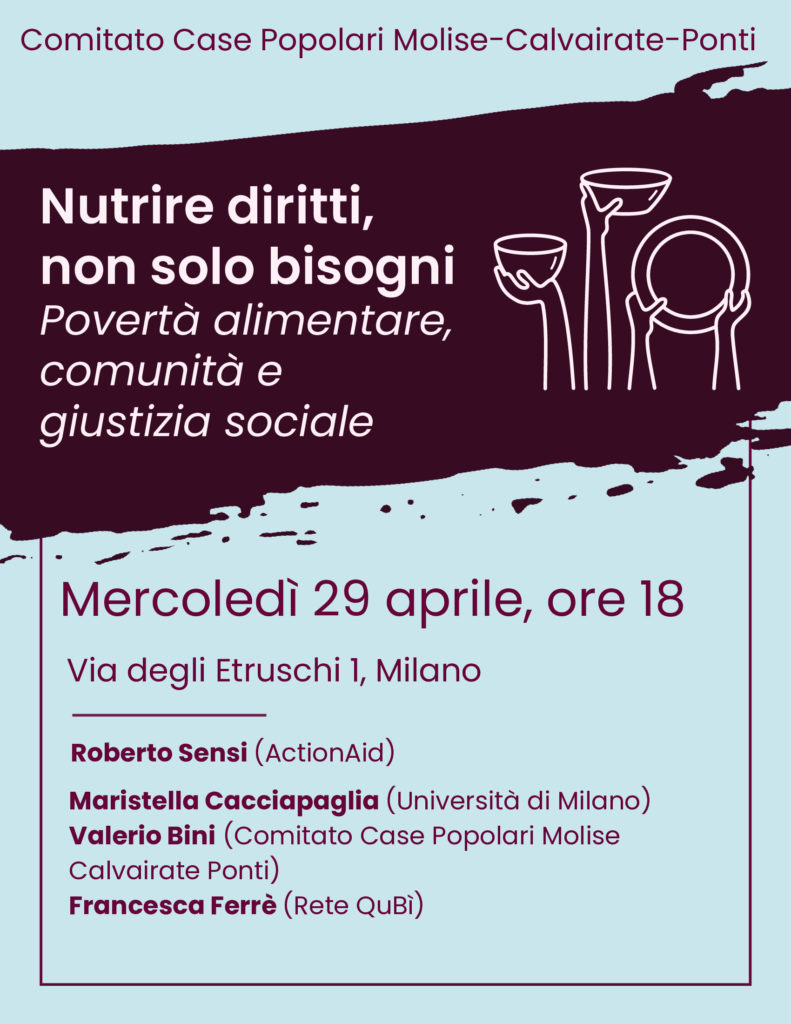 A Milano il 29 aprile alle ore 18, in collaborazione con il Comitato Inquiline Molise-Calvairate-Ponti, si svolgerà un momento di riflessione pubblica dal titolo: “Nutrire i diritti, non solo i bisogni: povertà alimentare, comunità e giustizia sociale”.