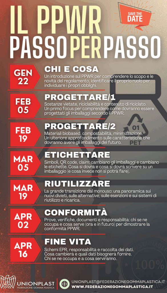 Un ciclo di sette webinar tematici per supportare le imprese nella comprensione e nell’attuazione del Regolamento (UE) 2025/40 sugli imballaggi e i rifiuti di imballaggio (PPWR). L’iniziativa è promossa da Unionplast e si rivolge alle aziende della filiera in vista dell’entrata in applicazione progressiva del regolamento, prevista a partire dal 12 agosto 2026.