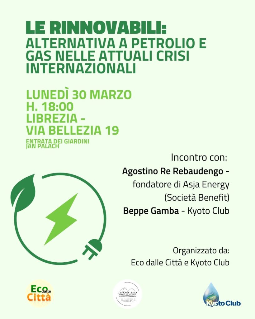 Interverranno Agostino Re Rebaudengo, fondatore di Asja Energy, e Beppe Gamba del Kyoto Club, che porteranno contributi legati allo sviluppo delle rinnovabili e alle politiche climatiche. L’incontro è aperto al pubblico e rappresenta un momento di confronto tra cittadini ed esperti sui temi della transizione energetica.