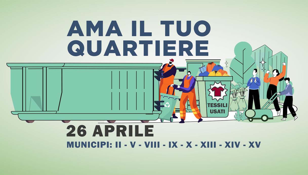 Sabato 26 aprile torna a Roma la campagna “Ama il tuo quartiere”, promossa da AMA S.p.A. in collaborazione con il TGR Lazio Rai, con una nuova giornata dedicata alla raccolta straordinaria di rifiuti ingombranti e materiali non conferibili nei cassonetti.