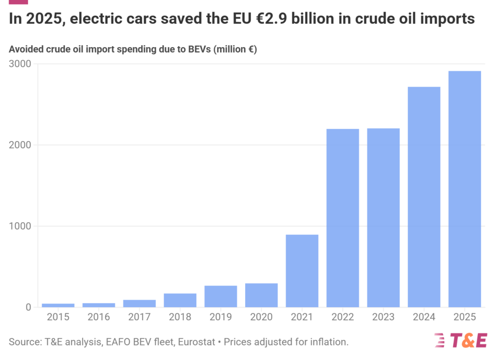 Nel 2025, l’Unione ha importato un miliardo di barili di petrolio per auto, pari a 67 miliardi di euro, secondo l’analisi di T&E. Ma gli otto milioni di veicoli elettrici già sulle strade europee hanno fatto risparmiare al blocco 46 milioni di barili di importazioni di petrolio, per un valore di 2,9 miliardi di euro.