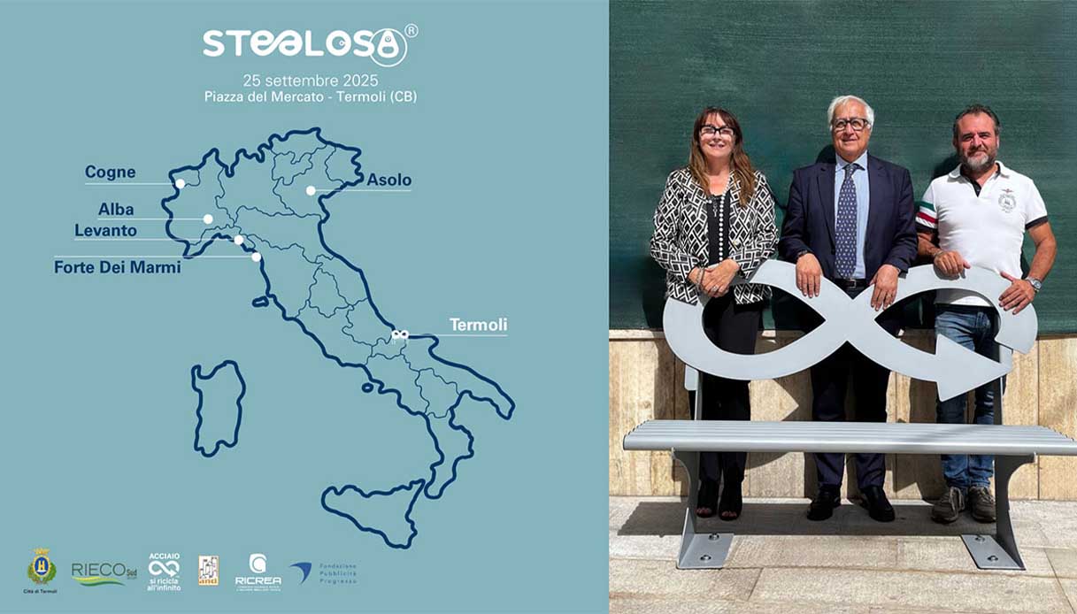 Il viaggio di Steelosa®, la panchina simbolo del riciclo infinito dell’acciaio, fa tappa in Molise, approdando a Termoli. Dopo le installazioni di Alba, Levanto, Forte dei Marmi, Cogne e Asolo, l’opera è stata collocata in Piazza Mercato, cuore della città e luogo di incontro per la comunità.