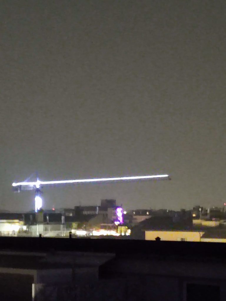Per la prima volta nel cielo della già assai illuminata città di Torino è apparsa una gru. Una gru completamente illuminata, nella sua parte alta e orizzontale, nella sua colonna d’ appoggio verticale. Non è una illuminazione “antiaerea” come quella intermittente dei grattacieli Intesa e Regione. Non è una illuminazione artistica. E’ una banalissima illuminazione a led bianchi, di quelli più abbaglianti.
