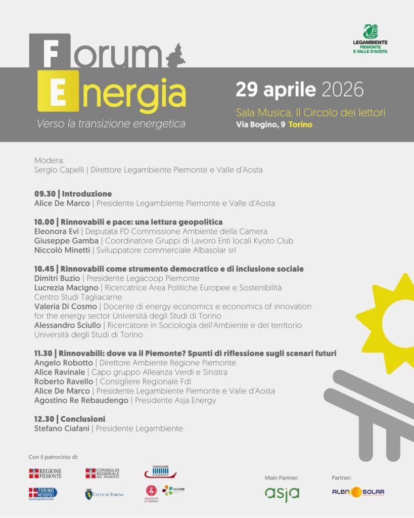 È previsto per mercoledì 29 aprile al Circolo dei Lettori di Torino (via Bogino 9, Sala Musica) il “Forum Energia: verso la transizione energetica” organizzato da Legambiente Piemonte e Valle D’Aosta con il patrocinio del Comune di Torino, della Regione Piemonte e dell’Università di Torino. Come nel 2025, l’evento sarà incentrato sul tema delle rinnovabili, con partenza alle 9:30. Tra gli ospiti, la deputata Eleonora Evi.