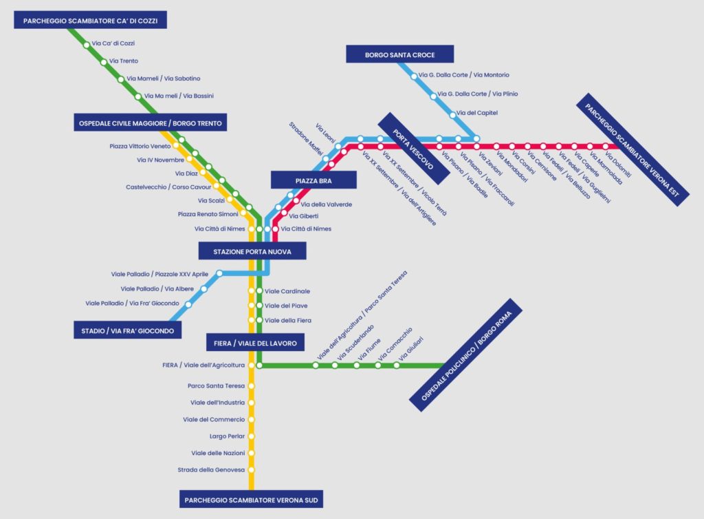 Il nuovo sistema di trasporto prevede una rete filoviaria di 24,6 km in parte elettrificata e in parte percorsa da mezzi in marcia autonoma, e consentirà con le sue quattro linee di collegare i punti cardinali del capoluogo scaligero. I filobus sono mezzi a emissioni zero che si ricaricano in corsa e quindi non devono rimanere fermi in deposito in attesa che le batterie siano pronte. Questo permetterà un maggior numero di mezzi di circolazione e quindi una frequenza elevata nel passaggio alle fermate.
